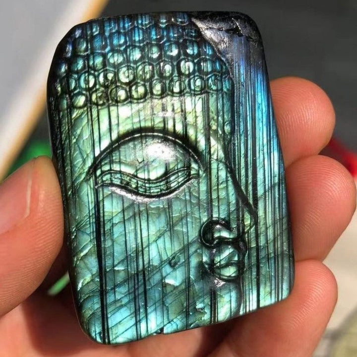 Das Buddha-Bild, das Erleuchtung , Einheit und Frieden darstellt , verschmilzt mit der Mystik und Schönheit des Labradorits und erzeugt so eine starke Bedeutung in einem authentischen Kunstwerk!
