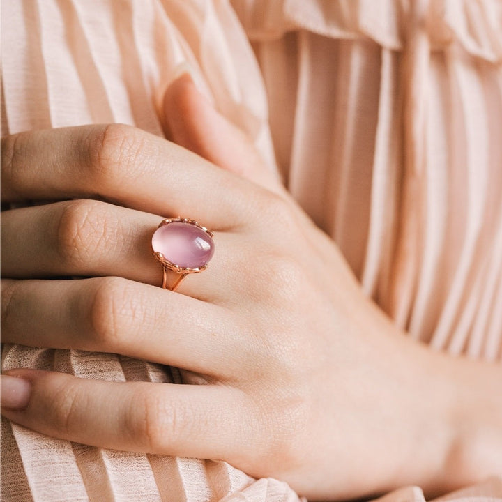 Spüren Sie die wohltuende Liebe der Natur, indem Sie unseren Edelsteinring aus natürlichem Rosenquarz an Ihrem Finger tragen.