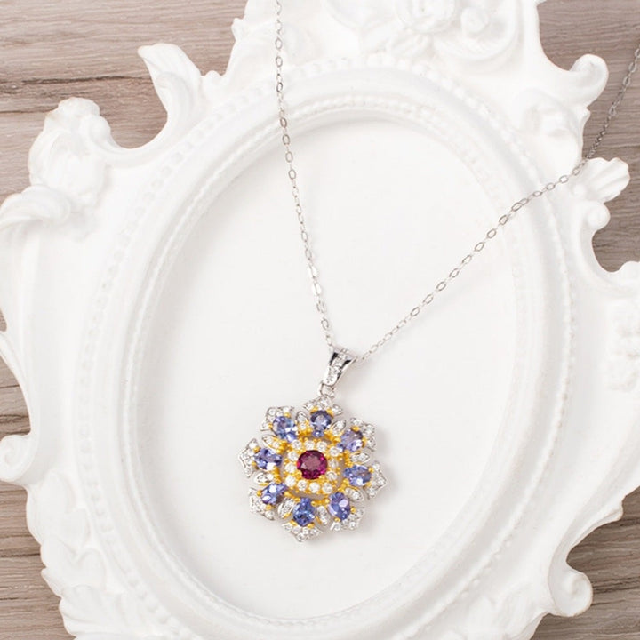 Diese Halskette kombiniert den natürlichen blauen Glanz des Tansanits mit dem leuchtenden Rot des brasilianischen Granats in einem Silberstück mit goldenen Akzenten und ist voller einzigartiger Formen, Muster und Details, die sie wirklich einzigartig machen.