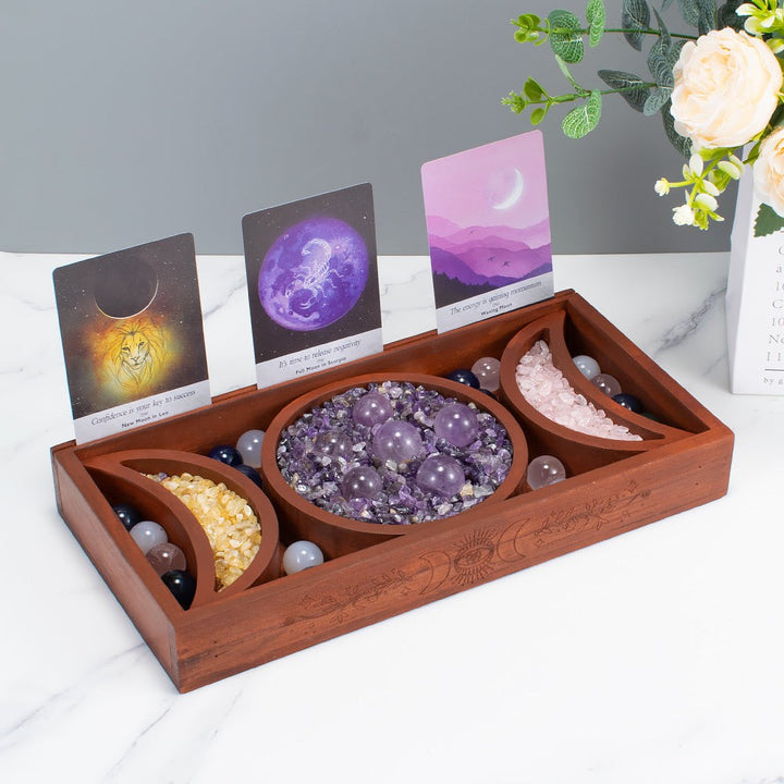 Il est gravé de toutes les phases de la Lune et décoré de trois compartiments lunaires en bois pouvant contenir tous vos cristaux préférés.