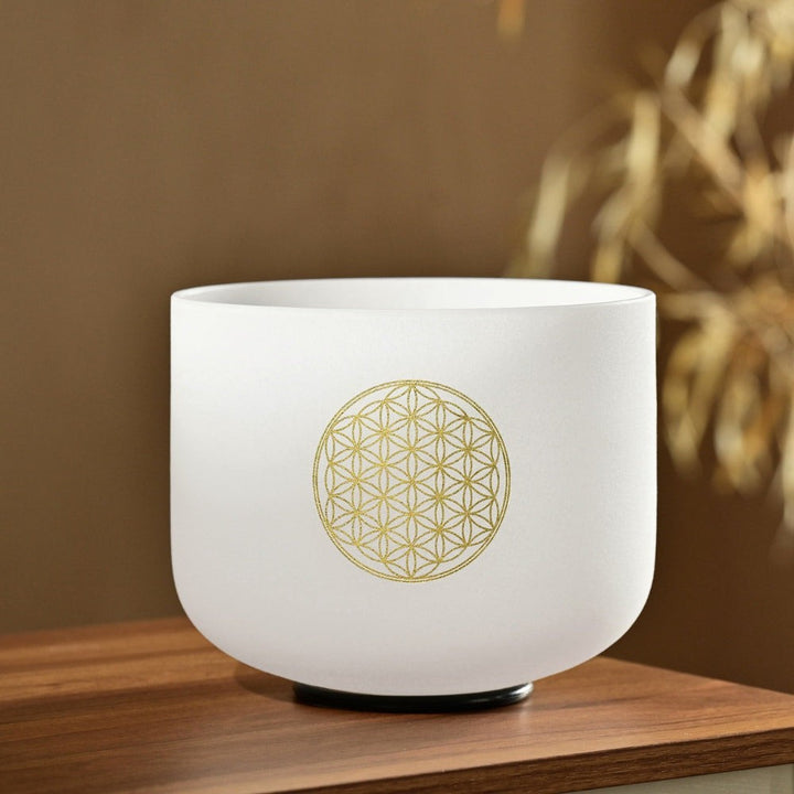 Notre bol chantant en cristal, orné du motif sacré de la Fleur de Vie, combine la sagesse intemporelle de la géométrie sacrée avec la pureté éthérée du cristal de quartz.