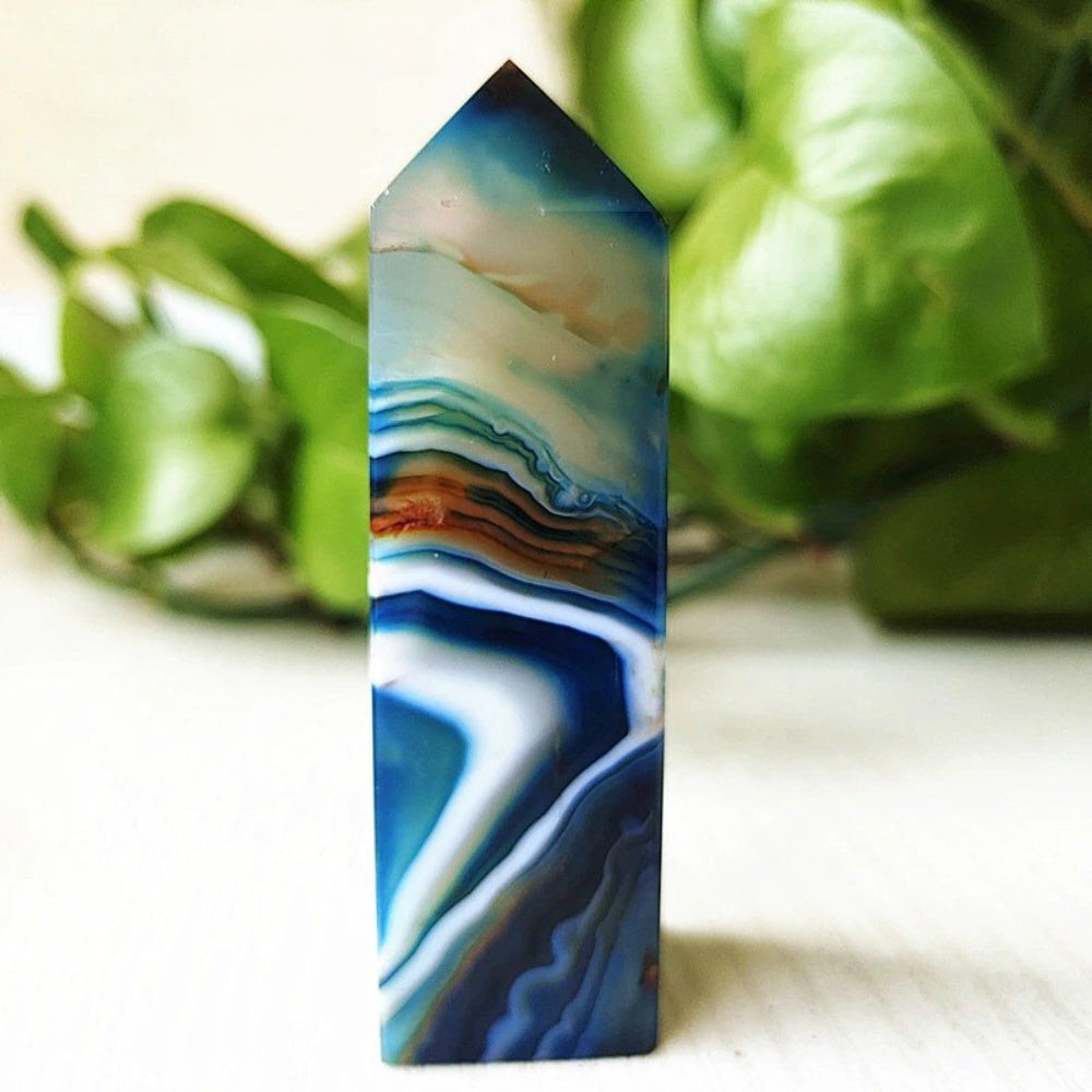 Cette fascinante pointe de cristal d'agate de soie bleue est un article unique pour tout amateur de bien-être ou de cristal.