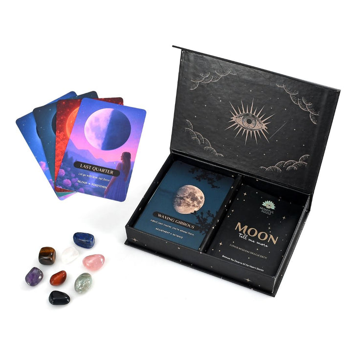 Crystal pairings, rituals, spreads, and detailed card meanings written by our team of astrologers and spiritual experts. Perfect even if you've never worked with oracle cards before. - 8 Surprise Crystals Inside A little gift from us—8 natural crystals to support every moon phase! Each one was handpicked to help you stay clear, grounded, and connected through it all.